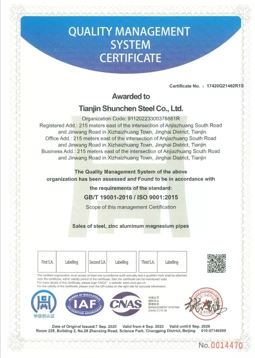 استانداردها: GB/T 3091-2015 "لوله های فولادی جوش داده شده برای انتقال سیالات کم فشار"، GB/T 13912-2020 "لوله های فولادی گالوانیزه گرم". محصول تست شخص ثالث را پشت سر گذاشته است و دارای یک گزارش تست است.