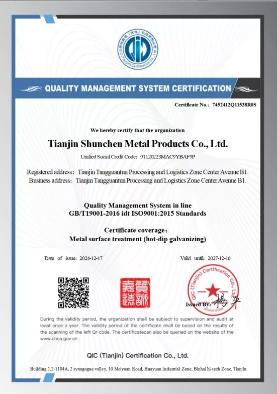 شرکت صنعتی تیانجین شونچن بیش از سه دهه تجربه تولید در صنعت فولاد انباشته است. این شرکت دارای گواهینامه های سیستم ISO 9000، 3A و همچنین گواهینامه CE اتحادیه اروپا است و یک طرح زنجیره صنعتی کامل از پردازش گالوانیزه تا فروش و توزیع را ایجاد کرده است. این شرکت از طریق جریانهای فرآیند 12 مرحلهای دقیق و مکانیزم بازرسی جامع سهلایه، به رکورد صفر تصادفات کیفیت و ایمنی سالانه و پیشفرض صفر سفارش برای 12 سال متوالی دست یافته است. Shunchen Industrial در تمام طول سال بیش از 20000 تن موجودی فولاد گالوانیزه را نگهداری می کند که یک سوپرمارکت فولاد گالوانیزه در مقیاس بزرگ را تشکیل می دهد که انبارداری و توزیع را یکپارچه می کند. این انبار مساحتی بالغ بر 10000 متر مربع را پوشش می دهد که از خدمات یکپارچه تولید و فروش پشتیبانی می کند.